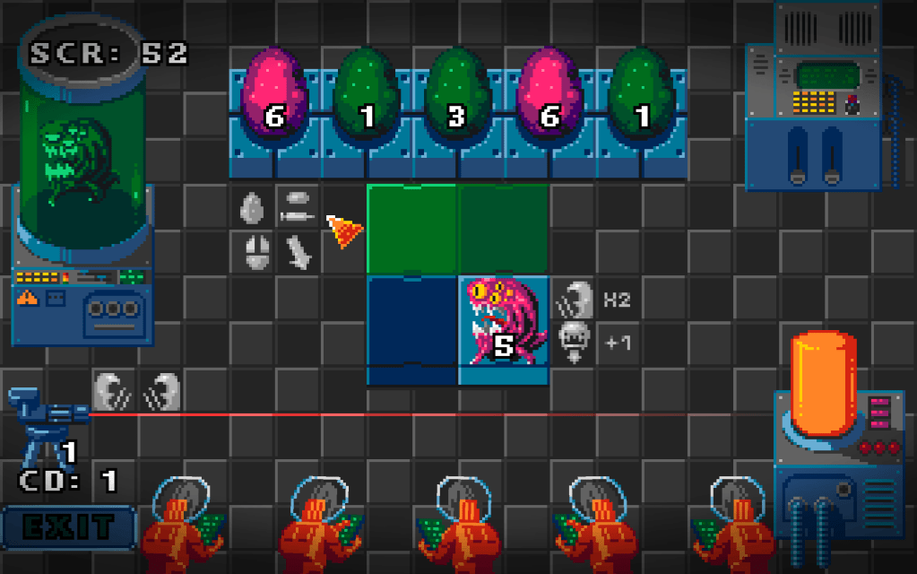 So, this game is about scientists experimenting on monster eggs, that can hatch monsters on the grid (middle of the screen). There are some equipment that can help them: syringes and pills that can modify the eggs’ and monsters’ number and an autocannon, that is able to defend them, should a monster gets free. As the eggs have numbers on them, representing their power and the hatching monster will have that number. Two monsters with the same number defeat each other, that will decrease the cooldown for the next autocannon ammo. Otherwise, player have to place the eggs, so the hatching monster on top could defeat the already existing monster on the grid. If a monster moves one step down, gets +1 power. If they defeat another monster, their remaining power doubles. Should a monster gets free – it’s on the lower grid and no same or bigger number monster can be placed – and no ammo for the autocannon, the monster will take out one of the labguys, that’s -1 life basically. If all are gone, it’s game over. This is all to know, so with a little luck, players can play for a long time.