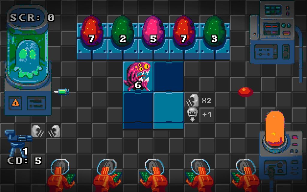 So, this game is about scientists experimenting on monster eggs, that can hatch monsters on the grid (middle of the screen). There are some equipment that can help them: syringes and pills that can modify the eggs’ and monsters’ number and an autocannon, that is able to defend them, should a monster gets free. As the eggs have numbers on them, representing their power and the hatching monster will have that number. Two monsters with the same number defeat each other, that will decrease the cooldown for the next autocannon ammo. Otherwise, player have to place the eggs, so the hatching monster on top could defeat the already existing monster on the grid. If a monster moves one step down, gets +1 power. If they defeat another monster, their remaining power doubles. Should a monster gets free – it’s on the lower grid and no same or bigger number monster can be placed – and no ammo for the autocannon, the monster will take out one of the labguys, that’s -1 life basically. If all are gone, it’s game over. This is all to know, so with a little luck, players can play for a long time.