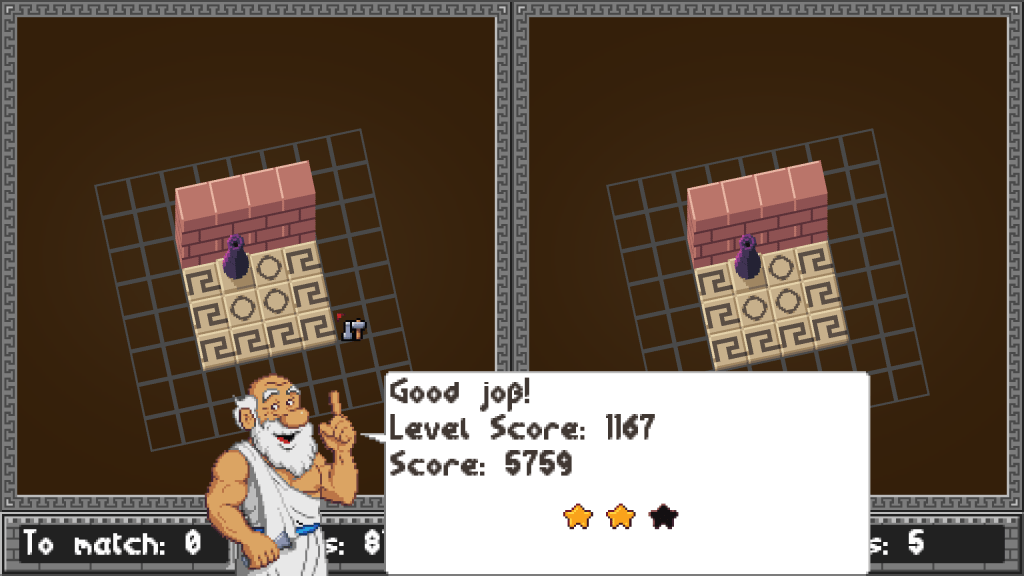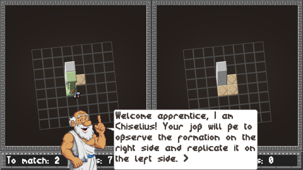 The game itself is about that the player becomes the apprentice of Chiselius, as he tutors the player, then just let finish up the rest. The game is a kind of organizing / cozy game, there is no real “danger”, though there is a score system (that manages to give negative points for the players’ efforts, but never mind that :)). The screen is divided to two parts. Right side is the reference, that’s what the player should have in the end on the left side too, matching formation, objects and at the same place. The GUI has some general information on it, like how many steps were taken, score, and how many stars the player collected so far. These are all score factors. The useful information is the To match: it shows how many elements is still off. If it goes up, you can be certain, something were placed at the wrong place. The player only can use the left side, clicking on an empty grid will place a big stone slab. Left click will chisel it down to a smaller object: column, then an ornament, then floor tile, then it’s destroyed, back to be an empty grid. Right click on the other hand will change the current object to something similar: other type of walls, different columns, ornaments and different mosaic. Basically that’s all for the gameplay, Chiselius will give score and stars, using the mentioned numbers and a hidden timer.
