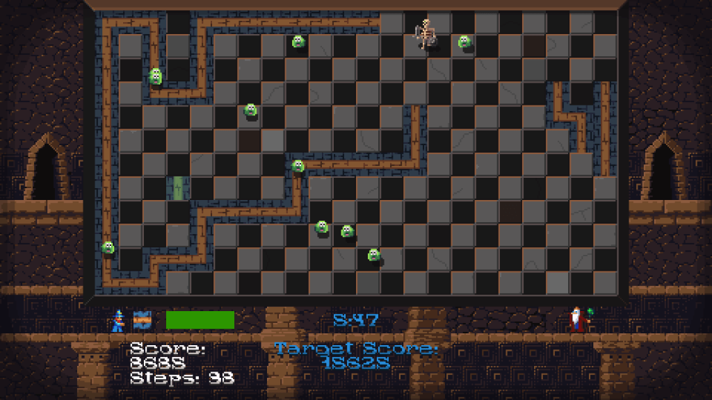 The game features a short timer too, it shows how long a tunnel piece can be held with magic and moved around. If time runs out before the tunnel piece is manually placed, the tunnel automatically drops. If there are no previously placed tunnels there (indicated by a tunnel icon), the one you moved around will be placed there. If there is another piece already under it (indicated by a skull), it’s game over: the sorcerer shoots at the apprentice, killing him. There is an ever-increasing target score: this shows that if you get enough points, the level resets, removing the unused tunnel pieces. I also made an infinity mode, with no timer, where is no sorcerer at the end, only the target score and your wits and luck.
