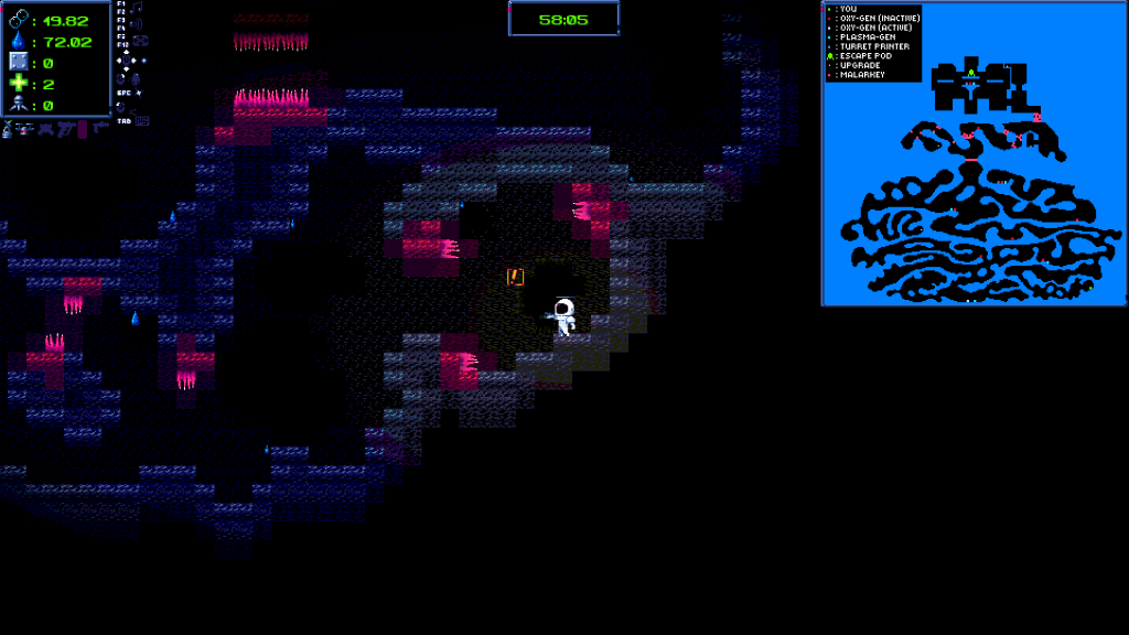 For the September 2025 HEJ game jam challenge, for the themes of “Zero Gravity” and “Solid-Liquid-Gas-Plasma” I made a game about an astronaut. How fitting, you might say. I had an idea a year ago, about a lost astronaut, where he should have been gather resources, craft stuff to survive on a small planet, then ascend to the meteor ridden space, and finally craft a spacecraft that is able to leave that place behind. The guy would have the planet’s flora and fauna as the enemy, so some defenses would be needed and oxygen management would have been one of the main part of the gameplay. That idea wasn’t going anywhere so I sliced a bunch of stuff, made it much more simpler: only two resources to mine, the third and oxygen can be generated from water on pre-placed stations. Oxygen generators are double as checkpoints too, where the player gets back when the astronaut runs out of oxygen (using it up, or if an enemy touches the astronaut, it also decreases the oxygen), or can teleport back before that. So, basically no dying here, only getting back to a checkpoint. Other than that, there are plasma generators, turret printers and some upgrades that make possible, or help to progress on the level. The final goal is to find the broken escape pod, repair it, fill it up with water and plasma before the time runs out and there is your happy ending… more on that later though.